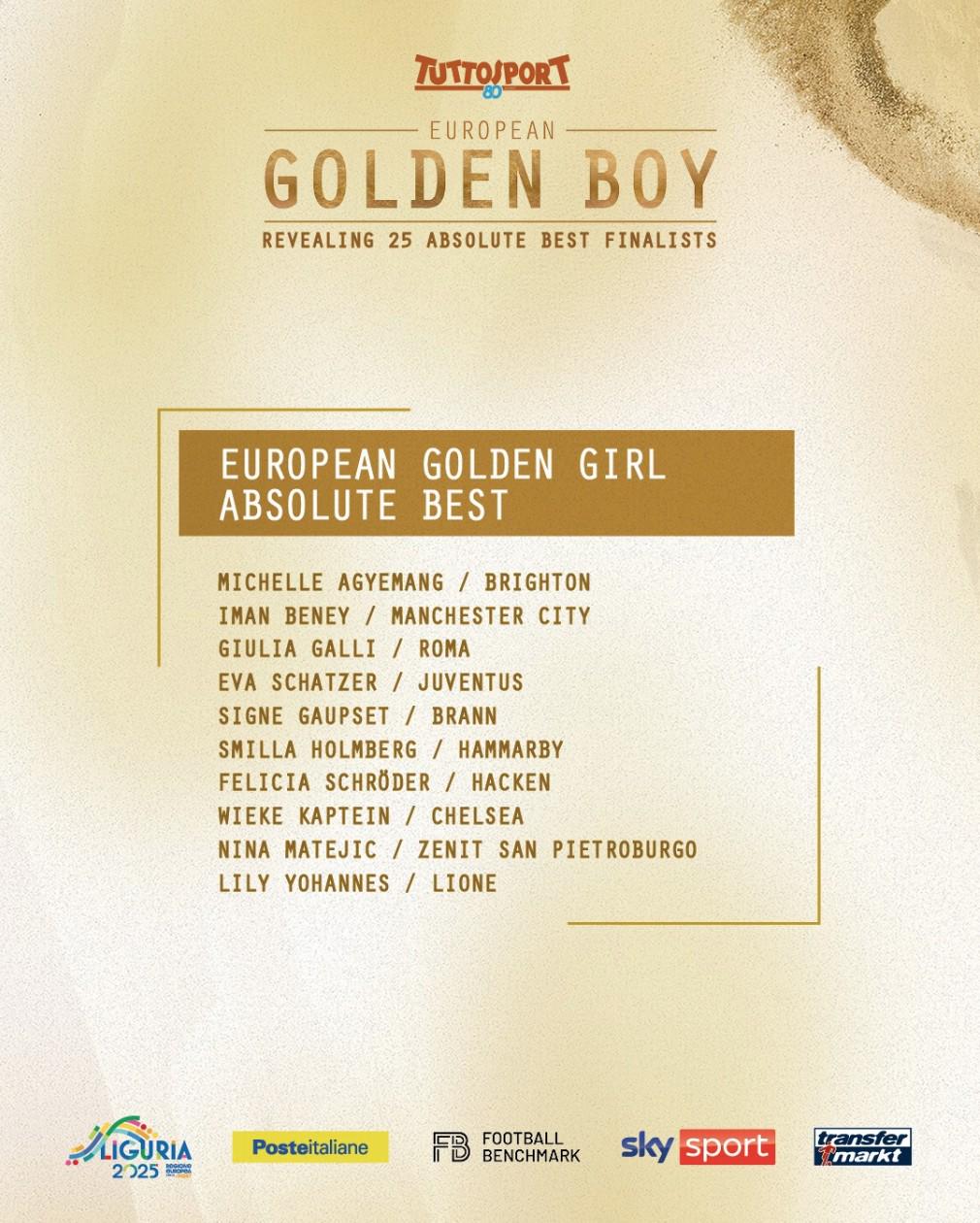 2025年女足金童奖候选:阿杰芒、卡普泰因领衔